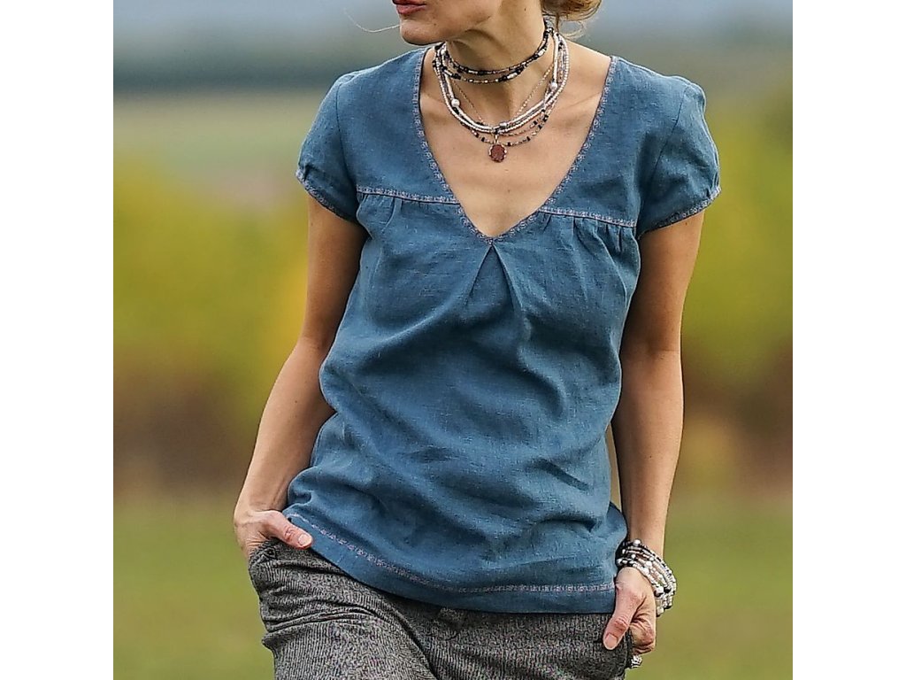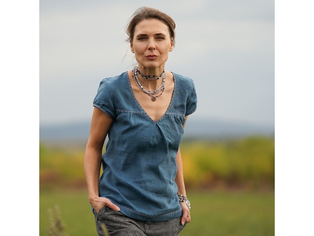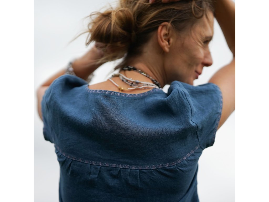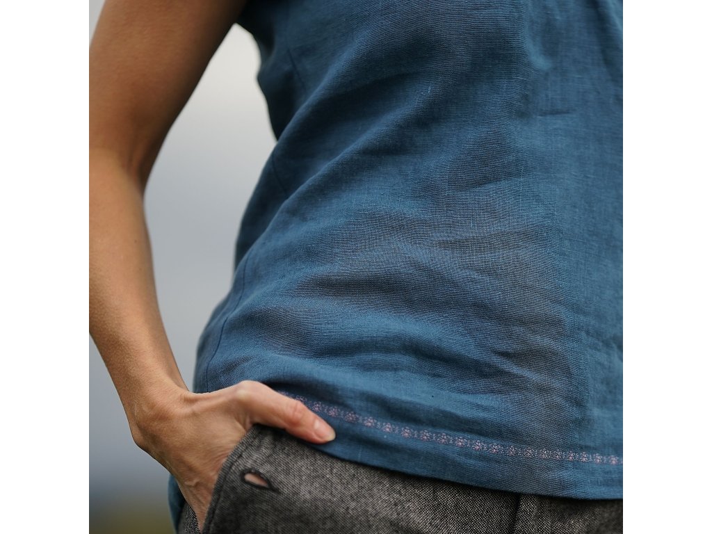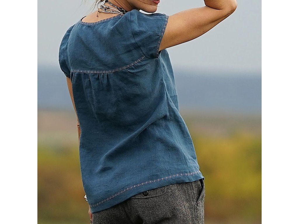 Lněná halenka petrolejová s řasením a jemnou strojovou výšivkou v růžové barvě. Halenka má krátký rukáv, v sedle jemné řasení. Je vhodná na jaro, léto a podzim.