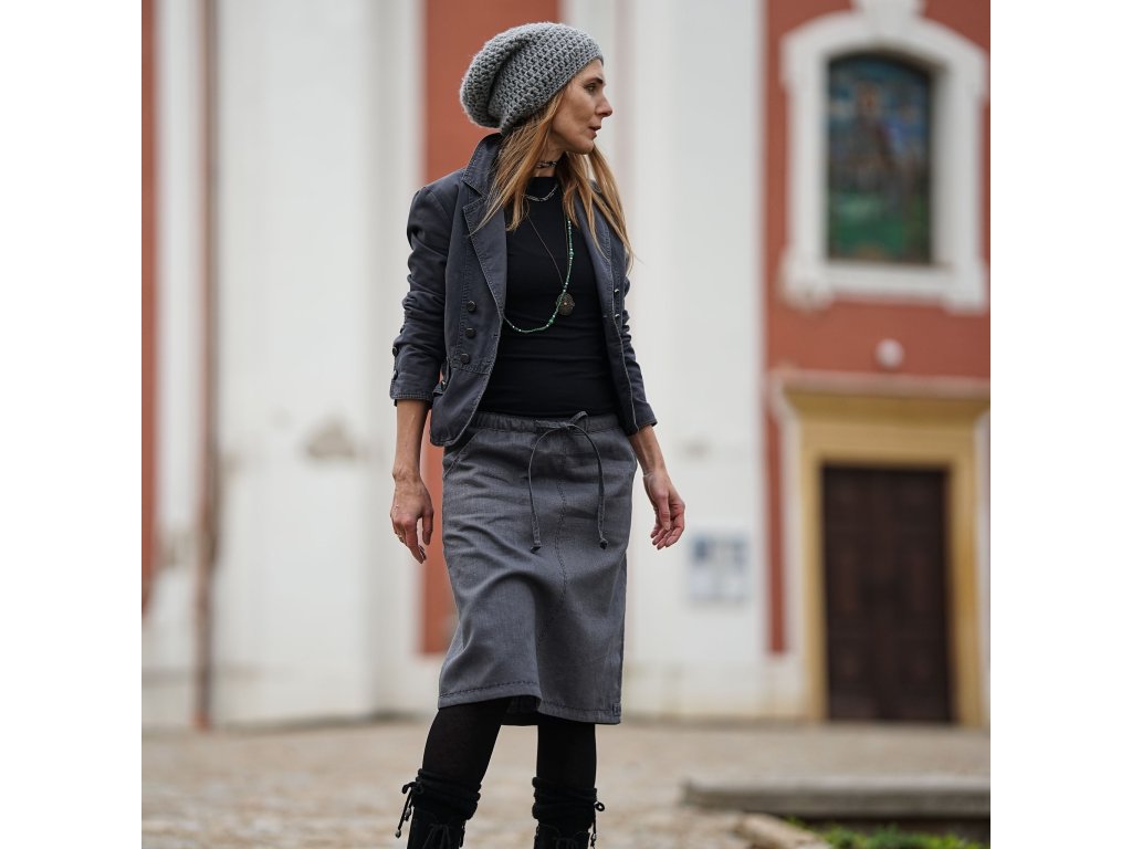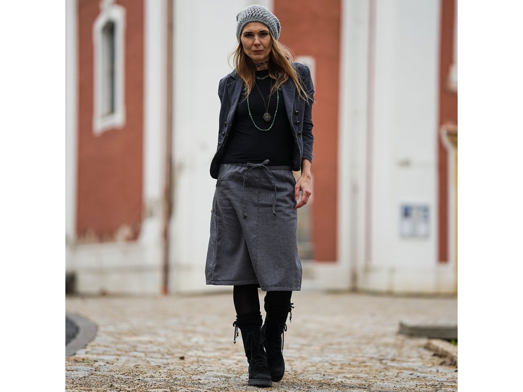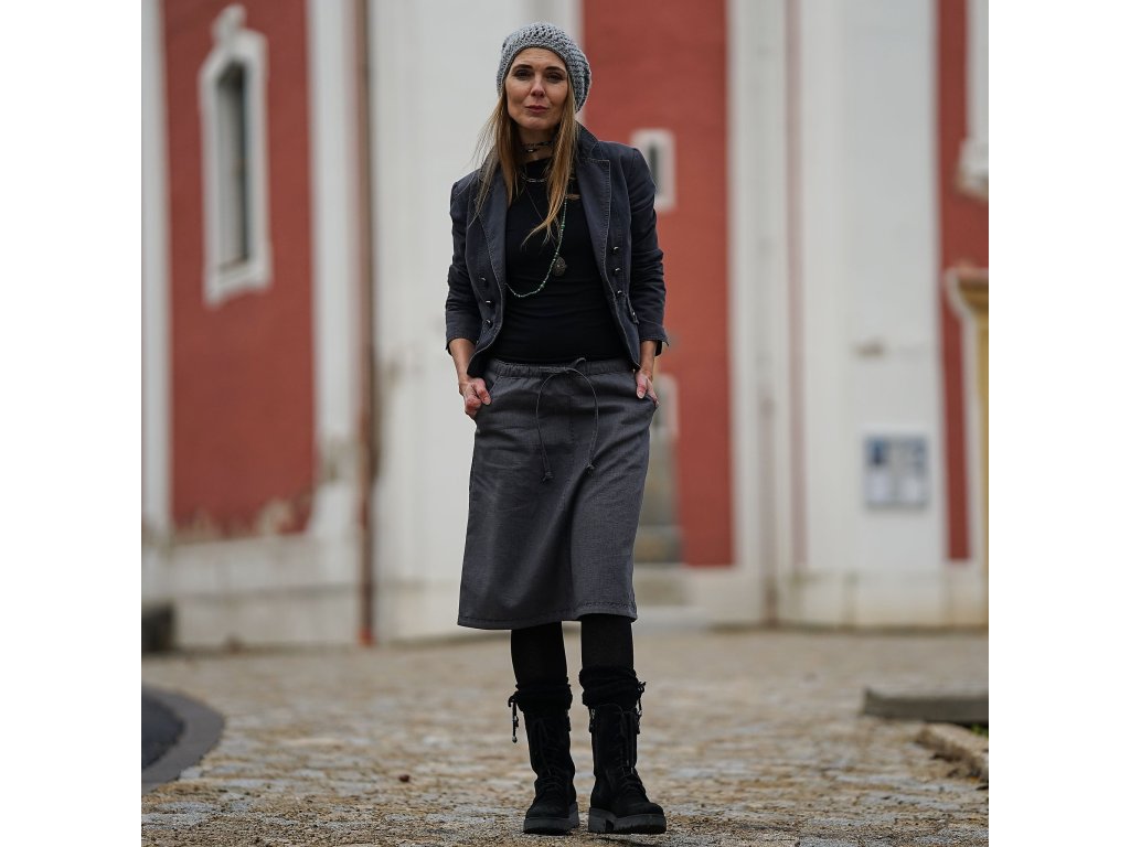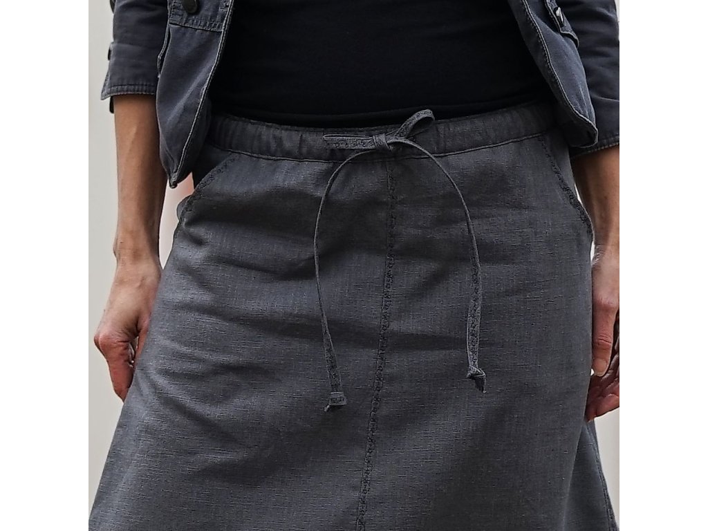 Lněná sukně áčkového střihu v šedé barvě zdobená výšivkou. Vhodná pro celoroční nošení. Sukně má dvě kapsy, v pase je všitá guma a sukni lze také v pase stáhnout šňůrkou.