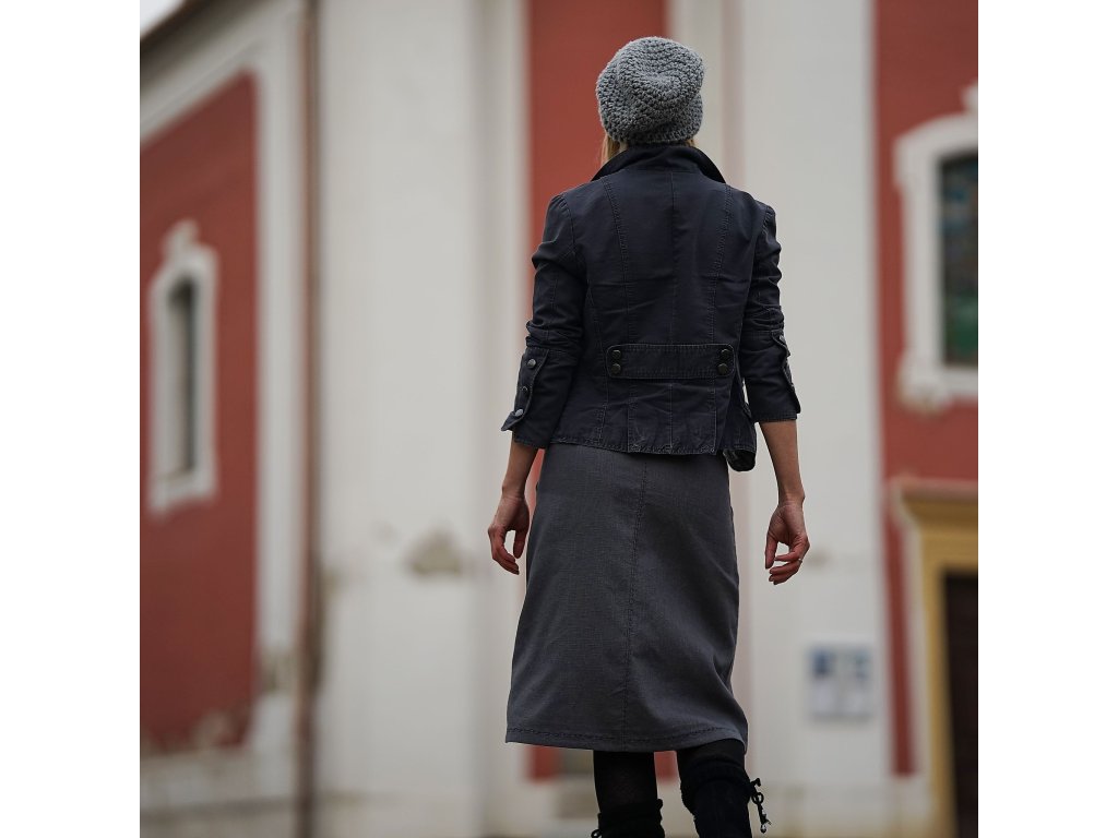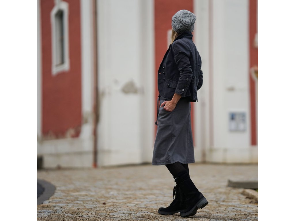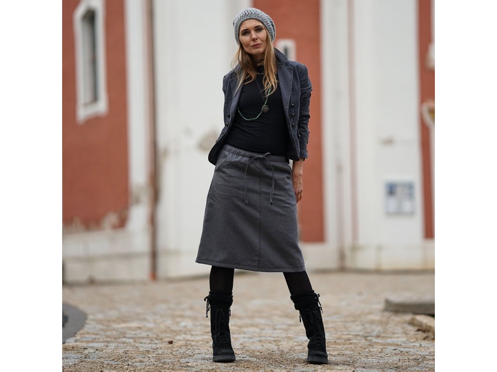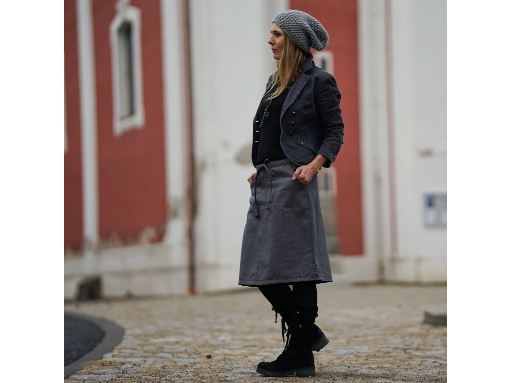 Lněná sukně áčkového střihu v šedé barvě zdobená výšivkou. Vhodná pro celoroční nošení. Sukně má dvě kapsy, v pase je všitá guma a sukni lze také v pase stáhnout šňůrkou.